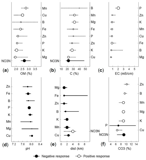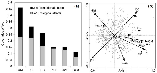 Taking into account Figure 6a, the importance of descriptor variables on NO3N, P, K, Fe, Mg, Mn, Cu, Zn, and B variation based on their marginal and conditional effect follows the order OM > C > EC > pH > dist > CO3. Taking into account Figure 6b, the most important observations are the following: