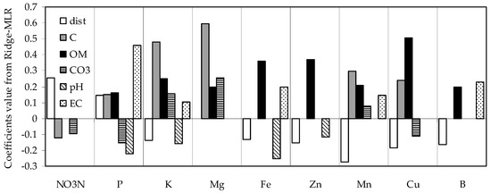 - C and OM values are negatively correlated with dist and NO3N values and positively correlated with P, K, Fe, Mg, Mn, Cu, Zn, and B. Thus, soils closer to the coastline are more likely to have higher C and higher OM, while they also have a lower probability to present P, K, Fe, Mg, Mn, Cu, Zn, and B deficiency. On the other hand, the soils with lower OM and C values that are far from the coastline are more likely to show higher values of NO3N and a higher probability to present P, K, Fe, Mg, Mn, Cu, Zn, and B deficiency.