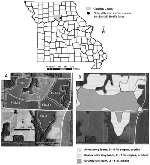 This study was conducted at the NRCS Soil Health Farm in Chariton County, north-central Missouri (Figure 1, 39°30′12″ N and 92°43′29″ W). In Chariton County, approximately 70% of the farmland is planted with crops and the size of an average farm is 147 hectares (363 acres) [34]. Annual average temperature is 12 °C (54 °F), and mean temperatures in July is 30 °C (86 °F). The 30-year average precipitation is 101 cm (40 inches), and this area receives ~28 cm (11 inches) of snow per year [35].
