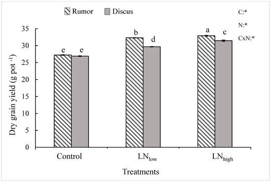 Total grain yield (g DW pot−1) in response to late application of N fertilizers (Control, LNlow, LNhigh) for two cultivars Rumor and Discus. Bars represent mean values ± SE (n = 3). Different small letters indicate significant differences between all treatment combinations (p ≤ 0.05); Two-way ANOVA results are shown in the upper right corner of the diagram. C: cultivar; N: different fertilizer treatment; CxN: Interaction between cultivar and different fertilizer treatment; *: significant effect.