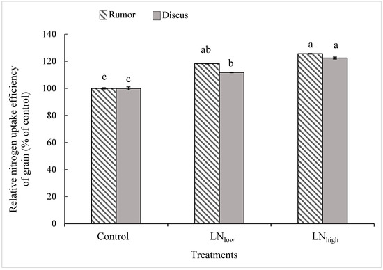 Relative N uptake efficiency of grains (% of control) in response to late application of N fertilizers (Control, LNlow, LNhigh) for the two cultivars Rumor and Discus. Bars represent mean values ± SE (n = 3). Different small letters indicate significant differences between all treatment combinations (p ≤ 0.05).