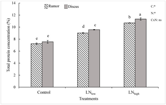 Total protein concentration (% of dry weight) in response to late application of N fertilizers (Control, LNlow, LNhigh) for the two cultivars Rumor and Discus. Bars represent mean values ± SE (n = 3). Different small letters indicate significant differences between all treatment combinations (p ≤ 0.05). Two-way ANOVA results are shown in the upper right corner of the diagram. C: cultivar; N: different fertilizer treatment; CxN: Interaction between cultivar and different fertilizer treatment; ns: not significant; *: significant effect.