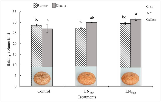 Baking volume [ml] in response to late N fertilization (Control, LNlow, LNhigh) for the two cultivars Rumor and Discus. Bars represent mean values ± SE (n = 3). Different small letters indicate significant differences between all treatment combinations (p ≤ 0.05). Two-way ANOVA results are shown in the upper right corner. C: cultivar; N: different fertilizer treatment; CxN: Interaction between cultivar and different fertilizer treatment. ns: not significant; *: significant effect. Representative pictures of mini-loaf produced by the micro baking test for Discus are shown at the bottom of the graph.