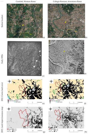 The urban system extended from about 7% of the municipal area in 1960 to nearly 27% in 2015 [52]. During the first 20 years of the study period, urban expansion was mainly restricted to the inner part of the municipality, followed by peripheral, less compact urbanization. Changes in land-use between 1980 and 2001 show, beside the increment of urban areas, a decrease of extensive agricultural land-use (not irrigated arable land, complex cultivation patterns, sparsely vegetated areas), and the increase of intensive agriculture and forest systems (permanently irrigated arable land, reforestations), as well as semi-natural mixed systems (forests and woodland shrubs) [53]. At the end of the 1990s, about 50% of the municipal area remained cultivated, mainly in peri-urban areas. Figure 1 illustrates aerial photographs of the two sites derived from Google Earth imagery (Figure 1a,b) and is enriched with specific maps of early 1950s (Figure 1c,d), other more recent urbanization derived from Corine Land Cover maps (Figure 1e,f) and a comprehensive land imperviousness assessment carried out by European Environment Agency in the framework of Land Copernicus initiative (Figure 1g,h). Average month data of air temperatures and precipitations between 1958 and 2017 were considered in this study. Using averages and other statistical indexes, data were aggregated at both annual and seasonal scale grouping years by 6 decades, 3 consecutive periods of 20 years (1958–1967, …, 2008–2017) and 2 consecutive periods of 30 years.