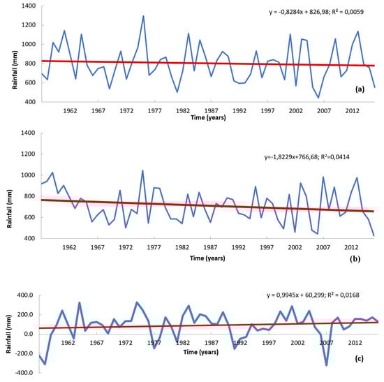 Analysis of climate variability based on ordinary least square regressions (Figure 2a,b), has been supplemented with a Mann-Kendall test—a non-parametric inference mainly used with non-gaussian data distributions—assessing the statistical relevance of monotonic upward or downward trends over time. Results of this test (Table 2) indicate the absence of any significant trend for both annual and seasonal precipitations along the analyzed time-series.