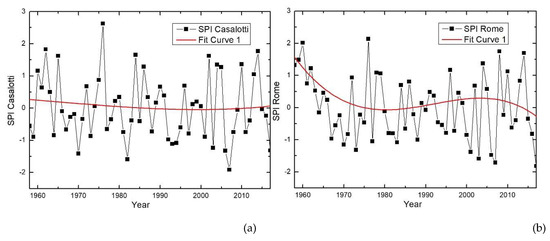 These last results do not exclude a-priori changes in specific climatic variables, especially for extreme events that represent the most attractive topic under the climate change literature [62,63]. Extreme drought and precipitation can cause considerable damage to agriculture, human economies, people’s livelihood and property, and even influence the social stability of entire regions [63,64,65]. Earlier studies suggest that the mean of a distribution has very little relationship to extremes and it has been shown that extremes may change to a greater extent than changes in mean [66,67,68]. A 5-order polynomial fitting method applied to the average annual FED (Frequency of Extreme Drought) has been used in order to study differences as well as commonality among different subareas from 1961 to 2015 in a Chinese site [69]. A similar approach is applied here to analyze possible variations in time for the SPI annual values of the two sites. To some extent, the SPI is a sensitive variable reflecting meteorological droughts, soil moisture variations and extreme precipitation events [70,71]. In Figure 3a time series of the annual SPI (broken lines) and 5-order polynomial fitting curves (red lines) are shown for Casalotti (a) and Collegio Romano (b) by year, 1958–2017. A F-test is performed to verify the H0 hypothesis that the fitting model significantly differs from a constant model. While the fitting model for Casalotti does not describe any trend different from a trivial constant behavior (F = 0.163, p = 0.96), for Collegio Romano a weak, significant trend (F = 3.40, p = 0.015), was observed. More specifically, it is possible to observe a marked SPI decrease until the 1980s, a slight upturn until 2005 and then definitely a downturn again until today, showing a trend towards longer droughts.
