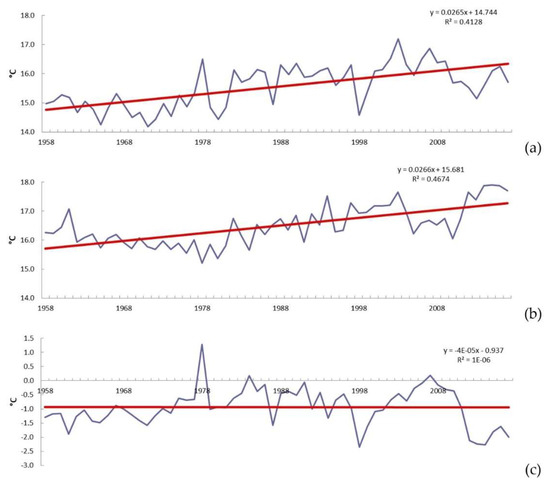 Figure 3 exposes the time series of the annual SPI (broken lines) and 5-order polynomial fitting curves (red curves) in Casalotti and Collegio Romano annually (from 1958 to 2017). From the same time period, Figure 4 reports the temporal trend concerning air temperature in Casalotti (a) and Collegio Romano (b). Furthermore, absolute difference between Casalotti and Collegio Romano by year was portrayed (Figure 4c). The blue line outlines the observed values, defining the trends of air temperature; while, the red line permits to draw the trend line in time, offering the corresponding equation.