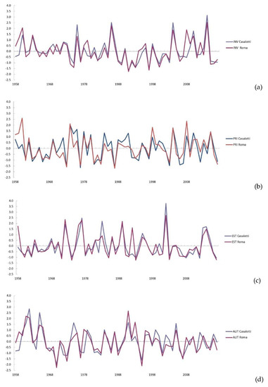 Standardized Precipitation Index (3 months’ time window) in Casalotti (blue) and Collegio Romano (red) by year, 1958–2017, from top to low panels: winter (a), spring (b), summer (c) and autumn (d).