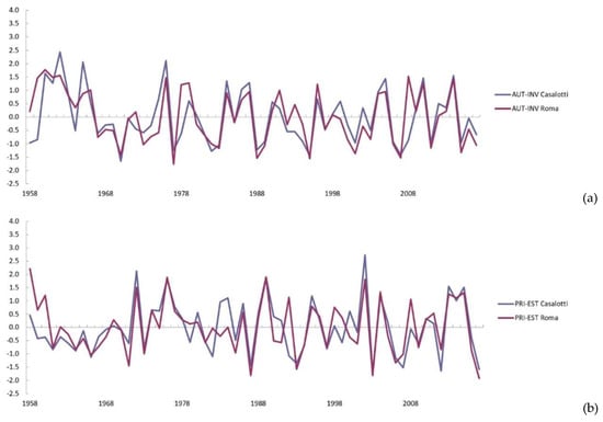 By computation on total precipitation over a given time horizon, a Standardized Precipitation Index (SPI) provided a general overview of drought regimes in the area (Figure 5). Considering a 3-months’ time window with the aim to investigate seasonal drought regimes, a total precipitation of 244 mm in winter (INV), 178 mm in spring (PRI), 77 mm in summer (EST) and 303 mm in autumn (AUT) was recorded, on average, in Casalotti. In Collegio Romano, a total precipitation of 206 mm in winter, 157 mm in spring, 78 mm in summer and 271 mm in autumn was observed. The maximum precipitation observed in Casalotti was 672 mm in 1962 autumn; the minimum precipitation was observed in summer 2000 (0 mm); in Collegio Romano, the maximum cumulated rainfall was observed in autumn 1991 (533 mm) and the minimum in summer 1993 (1.4 mm). Although few severe drought spells were observed in the study period, lower SPI scores were observed in such episodes in Collegio Romano than in Casalotti, especially in winter and autumn, corresponding to climatically wet periods in a typical Mediterranean climate, when the largest amount of rainfall is expected. Two severe drought episodes were observed in autumn (SPI < −2) for Collegio Romano.