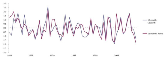 Assuming a time window of 12 months, average cumulated rainfall was higher in Casalotti (802 mm) than in Rome (711 mm) (Figure 7). Moderately severe episodes of drought were concentrated in the last two decades and show a relatively similar intensity in both Casalotti and Collegio Romano.