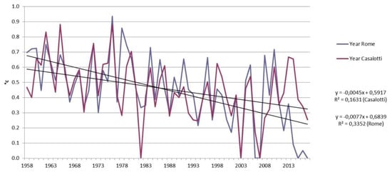For both sites, average temperature time series exhibited a slight upward trend, as revealed by a significant regression trend (R2 > 0.4) with a similar positive slope (≅0.026) and intercept (≅15 °C). An overall F-test allows to accept the hypothesis of a statistically significant (at a 0.05 level of significance) positive liner trend for both sites (F > 40, p < 0.001). A composite index, proposed by Perini et al. [72] and evaluating together standardized precipitations and temperatures (1: wet climatic regime; 0: dry climate regime), indicates a trend toward climate aridity over the study period. This trend was significant and particularly intense in Rome (R2 = 0.34) and less evident in Casalotti (R2 = 0.16), as clarified with the use of regression coefficients (Figure 8). For both sites, F-test of overall significance provides sufficient evidence (p < 0.001) that the regression model fits the data better than the model with no independent variables. A steep regression slope in Collegio Romano indicates increasing aridity and a milder increase was observed in Casalotti. Taken together, these results indicate a clear trend toward local warming in both sites, with climate aridity being more evident in the urban site in the last decade.