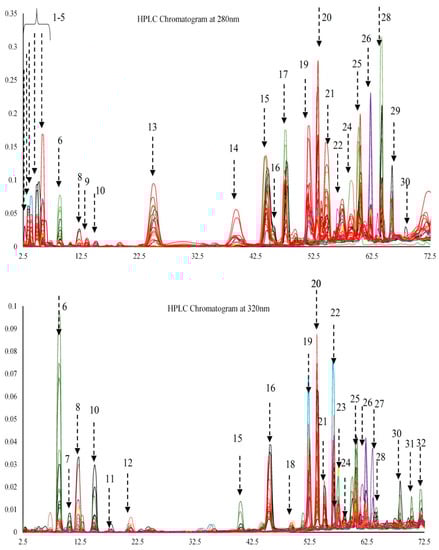 Phenolic chromatogram observed at 280 nm and 320 nm obtained for all the monocultivar EVOOs studied. Different colors represent olive oils derived from different geographical origin. Black = indigenous Maltese cultivars; green = foreign cultivars that are locally grown; red = Italian cultivars; blue = Greek origin; purple = French origin and yellow = Spanish origin.