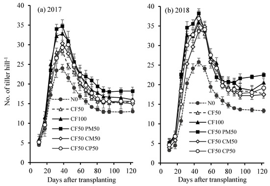In both years, tiller numbers increased rapidly in all treatments from 20 to 30 DAT (Figure 2) but were not significantly different among treatments. Nevertheless, higher tiller numbers were observed in the CF50PM50 treatment across all growth stages. The maximum tiller number was observed at 40 DAT; 34.73 and 38.22 tillers per hill in the CF50PM50 plots in 2017 and 2018, respectively (p < 0.01). Tiller numbers declined after 45 DAT in all treatments. At harvest time, the maximum tiller numbers of 18.2 and 22.5 tillers per hill were observed in CF50PM50 plots in 2017 and 2018, respectively. Tiller numbers in the CF100, CF50CM50, and CF50CP50 treatments were not significantly different in both years.