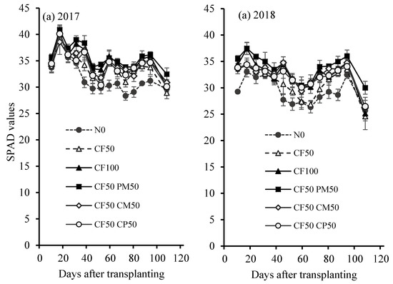SPAD values increased rapidly in all treatments from 0 to 17 DAT (Figure 3). Then they decreased slightly until 40 DAT (maximum tillering stage) and increased again from 59 DAT (panicle-initiation stage) in all treatments. During the grain-filling period, the maximum SPAD values of 36.15 and 36.59 were observed in the CF50PM50 treatment in 2017 and 2018, respectively (p < 0.01). The values decreased gradually until maturity. Primarily, the SPAD values were consistently higher in the CF50PM50 treatment across all growth stages in both years and were similarly low in the CF50CM50, CF50CP50, and CF100 treatments.