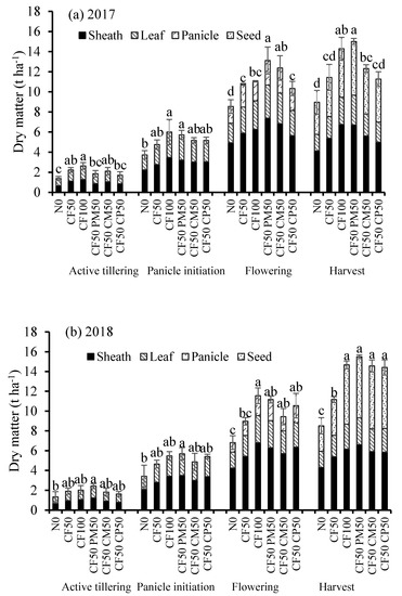 At the stages of active tillering, panicle initiation, flowering, and harvest, all plants were cut just above the ground. The plants were divided into sheaths, leaves, panicles, and seeds. Each plant part was oven-dried separately at 70 °C for 48 h and then immediately weighed. Dry matter (DM) accumulation was determined by summing the dry weights of sheaths, leaves, panicles, and seeds, and expressed as metric tons per hectare (t ha−1).