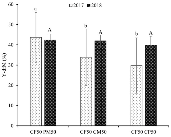 In 2017, the highest HI values observed were 0.48, 0.49, and 0.49 for CF50PM50, CF50CM50, and CF50CP50 plants, respectively (p < 0.05; Table 5). The highest HI values in 2018 were observed for plants in the same treatments, at 0.51, 0.51, and 0.49, respectively. HI values were low for both years with the sole application of CF.