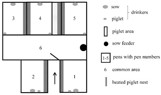 Group housing system layout with five farrowing pens and a central common area (published in Schrey et al. [31]).