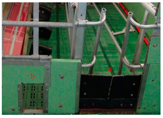 Farrowing pen with flexible steps at the entrance (a) and closable apertures in the pens’ board (b) to prevent the piglets from leaving the pens during the first post-partum days (Photo: Schrey).