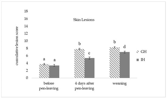 Least-Square-Means and standard errors (±SE) of the cumulative lesion score for the piglets during the suckling period (before pen-leaving = 1st week; 4 days after pen leaving = 2nd/3rd week; weaning = 5th week of life) for GH (group housing n = 274 piglets) and IH (individual housing n = 126 piglets). Significant differences are indicated by different letters (p < 0.05).