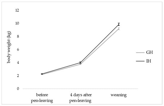The body weights did not differ significantly between both housing systems before and four days after the piglets had left the pens (p > 0.05, Figure 4). However, a significant increase in body weights during the different suckling weeks could be found in both housing systems (p < 0.001). At weaning, piglets from IH weighed more than piglets from GH (9.9 ± 0.2 kg vs. 9.2 ± 0.2 kg; p = 0.014, F = 6.099, df = 1).