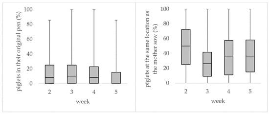 In the 2nd week, post-partum, immediately after the piglets had left the pens, more piglets were observed close to the mother sow, in comparison to the following weeks (2nd week: 50%, 3rd week: 26.1%, 4th week: 36.4%; 5th week: 36.4% of the total litter was located close to the mother sow, Figure 5). In contrast, only low percentages of piglets were found in their original pens, where they were born, during the entire suckling period (2nd week: 8.3%, 3rd week: 9.1%, 4th week: 8.3%, 5th week: 0% of the total litter born in the pen).