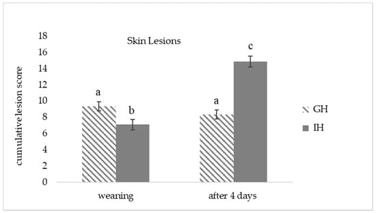 For the piglets originating from IH, the cumulative lesion score increased significantly during the first four days after weaning and mixing (7.1 ± 0.6 before weaning vs. 14.9 ± 0.7 four days after weaning; p = 0.014, F = 67.872, df = 1, Figure 6). In contrast, for the piglets originating from GH, the lesion scores were in a similar range during these four days (9.4 ± 0.6 before weaning vs. 8.3 ± 0.6 four days after weaning; p = 0.208, F = 3.355, df = 1).