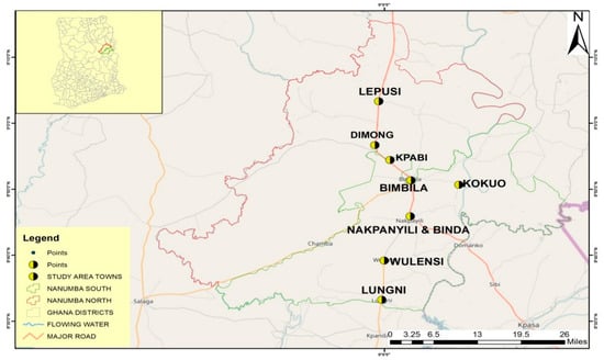The survey was conducted in two predominant yam growing districts in the northern region of Ghana, i.e., the Nanumba South (8°39′ N–0°01′ W) and Nanumba North (8°05′ N–0°04′ W districts. The communities covered were Lepusi, Dimong, Kpabi, and Bimbilla in the Nanumba North district and Kukuo, Nakpayili, Wulensi, and Lungni in the Nanumba South district. The survey was executed in three steps, including a structured questionnaire administration, focus group discussions, and community/field visits. The survey was conducted between 12–16 March 2015, shortly before the spraying season of April–May. In total, 100 yam farmers were interviewed and three focus group discussions were organized across the 8 communities in the two districts (Figure 1). The sample size (100) was determined from the total population (235,048) of Nanumba traditional [20], using the formula , by Charan & Biswas [21], where N is the total population in the area and e is the margin of error (10%). The questionnaire was designed in a manner to extract information about the socio-demographic characteristics of famers, farmers’ yam growing practices, and famers’ experience and opinions regarding causes of yam rots. The majority of the questions were close ended, with only a few of them being open ended. The questions were pretested with 10 farmers and emerging issues and shortcomings in the questionnaire were addressed before the actual interviews started. The research districts and communities were selected because major yam producers of the country are located in the region. Appendix presents details of the specific questions posed during the interviews.