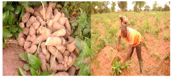 Yam (Dioscorea spp.), belonging to the genus Dioscorea, the order Liliflorae, and the family Dioscoreacae, is mainly grown in the tropical and sub-tropical countries of the world, including West Africa, the Caribbean, north and central parts of East Asia, and South and Central America [1,2,3,4]. It is an important food and income security crop for people in the tropical and subtropical regions [5,6]. It is reported to be an important source of minerals, such as calcium, phosphorus, iron, and carbohydrates and vitamins such as riboflavin, thiamin, vitamin B, and vitamin C [1,7]. Yam has been used in traditional medicine in Africa and among the Chinese and other Asiatic people to treat diseases like diabetes, to increase coronary circulation, and to prevent hypercholesterolemia [1,4,8]. In many yam growing communities in West Africa, yams play an important socio-cultural role, featuring in many traditional festivals. In some cases, a day is even set aside to celebrate the harvest of the new yams [3]. In the Nanumba traditional area of Ghana, and particularly in Wulensi, when it is time for harvesting new yams (the milking stage), most family heads from the royal families do not eat the yam until the formal ceremony, called “Nyuya Dibu” which welcomes the new yam, is organized. The “Nyuya Dibu” ceremony is normally organized on a Friday that coincides with the market day of the town, called “Aluzumma Kofei”.