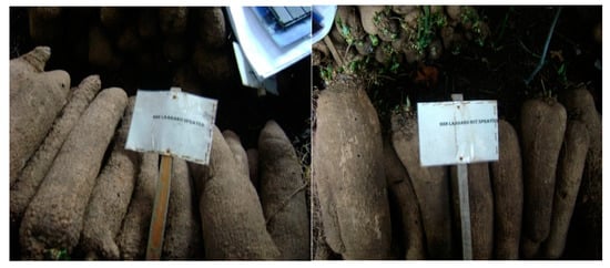 The ware yam was harvested towards the end of January and stored in traditional storage barn until the end of May. The harvesting was done with the use of a hoe and a cutlass and care was taken not to cause unnecessary bruises to the yam tubers, as this could enhance rots during storage [26]. The number of rotten tubers per plot, the number of market quality tubers per plot, and the total weight of market quality tubers per plot were counted as quality assessment parameters. The quality of a tuber was thereafter judged by its size and wholesomeness, i.e., no symptoms of rots, deep cuts, gals, and termite holes. In the storage facility, the yam tubers were placed according to the treatments and controls, with the appropriate labels attached to them (Figure 4). During storage, monthly inspections were done to check the level of rots. During these inspections, rotten tubers in each treatment were removed and counted. At the end of the storage period, counting and weighing were done again to determine the number of rotten tubers and the loss of weight after storage, respectively.