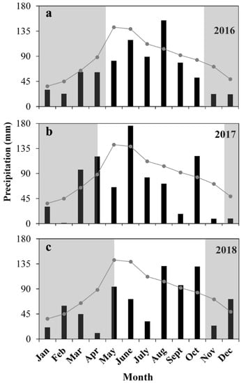Monthly rainfall distribution (bars) for 2016 (a), 2017 (b) and 2018 (c) and 30-year average (line) in Chariton County, Missouri. Shaded area represents the cover crop growing period.