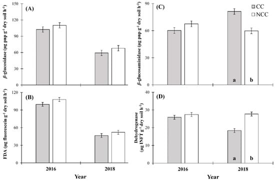 In 2014, two years after the initial CC establishment, VeVerka et al. [26] reported β-glucosidase levels in the range of 35–105 µg pnp g−1 dry soil h−1 under CC treatment at the same study site. In 2018, our study found the upper limit of the range had increased, with β-glucosidase levels ranging from 35 to 145 µg pnp g−1 dry soil h−1, which was six years after the initial CC establishment. Similarly, dehydrogenase levels changed from 8.5–16 µg TPF g−1 dry soil h−1 in 2014 to 10–40 µg INFT g−1 dry soil h−1 in 2018. However, the enzyme β-glucosaminidase did not show such differences from 2014 to 2018. In our study, β-glucosidase and FDA enzyme levels in 2016 were significantly greater in both CC and NCC treatments compared to 2018. In fact, the β-glucosidase level in 2016 was 1.7 times greater under CC and 1.6 times greater under NCC compared to 2018 (Figure 2A), while the FDA level in 2016 was 2.1 times greater under CC and 2.0 times greater under NCC compared to 2018 (Figure 2B). The dehydrogenase level in 2016 was 1.4 times greater in CC compared to 2018; however, no difference between 2016 and 2018 was found under NCC. In contrast, the β-glucosaminidase level in 2018 was 1.3 times greater in CC treatment compared to 2016, and in NCC, 1.1 times lower. Similarly, Mendes et al. [31] reported significant differences in β-glucosidase and FDA levels between 1995 and 1996 regardless of the treatments in a study conducted to identify winter cover crop effects on soil microbial activities. Relatively wet conditions in 2018 may have reduced overall enzyme activities in our study regardless of the treatment. It has been reported that irrigation and water management can change β-glucosidase, β-glucosaminidase and phosphodiesterase activities in cover crop–winter wheat and fallow–winter wheat rotations [32]. Soil microbial activities and soil water storage are purportedly negatively correlated, indicating the need for oxygen (O2) for aerobic respiration by microbes [26,33].