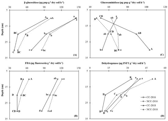 The β-glucosidase level significantly declined with increasing soil depth, both in 2016 and 2018 (Figure 3A). In 2016, the 0–10 cm soil depth revealed a 1.5 times greater β-glucosidase level compared to the 10–20 cm depth and 1.8 times compared to the 20–30 cm depth. In 2018, the 0–10 cm depth had a 1.9 times greater β-glucosidase level compared to 10–20 cm and 2.4 times greater compared to 20–30 cm. However, β-glucosidase levels did not show differences between CC and NCC treatments at 0–10, 10–20 or 20–30 cm soil depths in 2016 or 2018. Levels of the enzyme FDA also significantly declined with increasing soil depth in both 2016 and 2018 (Figure 3B). In 2016, the first (0–10 cm) and third (20–30 cm) soil depths had FDA levels of 121 and 86 µg fluorescein g−1 dry soil h−1, respectively, exhibiting a significant decline. This was reflected in the 2018 results, wherein the FDA levels again dropped significantly from 63 to 43 µg fluorescein g−1 dry soil h−1 for the first and third soil depths, respectively. Interestingly, in 2016, FDA levels did not show statistically significant differences between CC and NCC treatments at 0–10, 10–20 or 20–30 cm soil depths. However, in 2018, FDA levels were significantly greater at 0–10 and 10–20 cm soil depths in NCC compared to CC, with NCC having 10 µg fluorescein g−1 dry soil h−1 greater at 0–10 cm depth and 7 µg fluorescein g−1 dry soil h−1 at 10–20 cm. In contrast, β-glucosaminidase did not show a clear pattern with soil depth. The NCC treatment showed an increase in β-glucosaminidase with increasing soil depth from 0–10 cm to 20–30 cm in both years, while CC showed an increase with depth in 2018 and a reduction in 2016. VeVerka et al. [26] reported similar findings of significant increases (p < 0.01) in β-glucosaminidase activity with increasing soil depth. Further, in our study, β-glucosaminidase levels were significantly greater (9.7%) at 0–10 cm soil depth in CC compared to NCC in 2016; however, the difference was not significant in 2018 (Figure 3C). In contrast, β-glucosaminidase levels at 10–20 and 20–30 cm soil depths were significantly greater (1.4 and 1.5 times, respectively) in CC compared to NCC in 2018. Dehydrogenase levels also significantly declined with increasing soil depth, both in 2016 and 2018. The dehydrogenase level at 0–10 cm was 2.6 times greater compared to 20–30 cm in 2016 and 3.8 times greater in 2018. In 2018, dehydrogenase levels were significantly greater at 0–10 and 10–20 cm soil depths in NCC compared to CC. The differences were not significant in 2016 (Figure 3D). Other studies also have reported decreased enzymatic activities (arylsulphatase, β-glucosidase, phosphomonoesterases, urease, dehydrogenase, FDA hydrolysis, α-glucosidase, β-xylosidase, cellobiohydrolase) with increasing soil depth [36,37]. The influence of a changing soil environment with increasing soil depth reduces the abundance, composition and functions of soil microbes [36]. An increase in clay content with soil depth in claypan soils decreases porosity and organic matter content, thereby decreasing aeration [26]. This, in turn, reduces the microbial population density and leads to lower soil enzyme concentrations with increasing soil depth. Also, compositional changes in microbes with increasing soil depth can change the types of soil enzymes secreted. This may also be a factor in the reported reduction in soil enzyme activities with increasing soil depth.