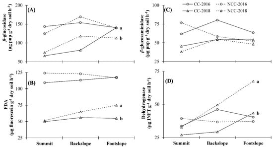 In 2016 at the first soil depth, the β-glucosidase level was significantly greater at the summit (1.9 times) and backslope positions (1.6 times) compared to 2018. At the footslope position, there was no difference between the two years. In 2018 at the first soil depth, the β-glucosidase level was significantly greater (24%) at the footslope site under CC treatment compared to NCC (Figure 4A). However, β-glucosidase at the first soil depth did not show significant differences between treatments at the summit or backslope positions in 2016 or 2018. Similarly, no significant differences were found between CC and NCC treatments for any landscape position at the second and third soil depths in 2016 or 2018. The FDA level at the first depth was significantly greater at the summit (3.4 times), backslope (2.9 times), and footslope (2.7 times) positions in 2016 compared to 2018. In 2018, the FDA level was significantly greater (36%) at the footslope site in NCC compared to CC. Dehydrogenase activity at the first soil depth did not show differences between the two years. However, in 2018, the dehydrogenase level was significantly greater (1.5 times) at the footslope position under NCC compared to CC. The differences between CC and NCC for dehydrogenase activity were not significant at other landscape positions. Finally, activity of the enzyme β-glucosaminidase was not different between treatments at any landscape position in 2016 or 2018.