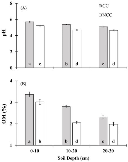 Change in pH (A) and percent organic matter (%OM; B) between cover crop (CC) and no cover crop (NCC) treatments at 0–10, 10–20 and 20–30 cm depth in 2018 at the Chariton County Cover Crop Soil Health Research and Demonstration Farm, Missouri, USA. Different letters show significant differences between treatments by soil depth at p < 0.05 level.