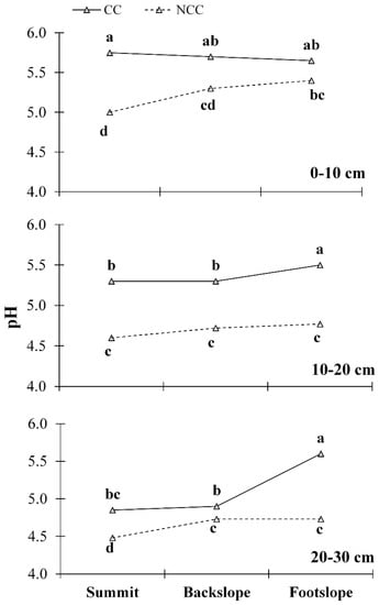 In this study, CC treatment showed significantly greater pH levels at the summit, backslope, and footslope positions for all three soil depths compared to NCC (Figure 6). Within the CC treatment, soil pH was not significantly different among summit, backslope, and footslope landscape positions at the 0–10 cm depth. In contrast, within the CC treatment, pH at the footslope showed significantly greater levels at the second and third depths compared to summit and back slopes. Within NCC treatment, pH was significantly greater at the footslope compared to the summit at the first and third soil depths.