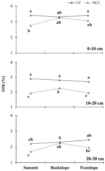 At the 10–20 cm depth, %OM was significantly greater in CC compared to NCC at the summit, backslope, and footslope landscape positions—specifically 1.5, 1.2 and 1.4 times greater, respectively. In the first and third soil depths, CC treatment showed significantly greater %OM levels only at the summit site compared to NCC (Figure 7). Within the CC treatment, organic matter percentage was not significantly different among landscape positions at any soil depth. VeVerka et al. [26] reported that the greatest organic carbon value was found at the summit position for both CC and NCC treatments, but the depth and landscape position effects were not significant between the two tested years (2012 and 2014) for soil organic carbon at the same study site. The results of our study demonstrated that CC growth increased soil organic matter levels at the summit position over the entire 0–30 cm depth and at backslope and footslope positions at 10-20 cm depth compared to NCC with time. The summit areas of the study site were flat and that may have allowed higher accumulation of organic matter under CC treatment. Sedimentation and accumulation of organic materials eroded from the backslope areas may have increased the organic matter levels in the footslope positions of the CC treatment.