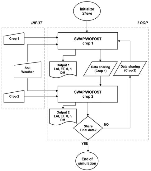 Flowchart of the intercropping Soil, Water, Atmosphere and Plant (SWAP 2×1D) functioning. INPUT, the section of model input data; LOOP, the sequence of model simulation and data sharing in SWAP 2×1D; Share, the routine managing the execution of SWAP 1D; LAI, leaf area index, ET evapotranspiration, θ soil water content, h soil pressure head, and DM crop yield.