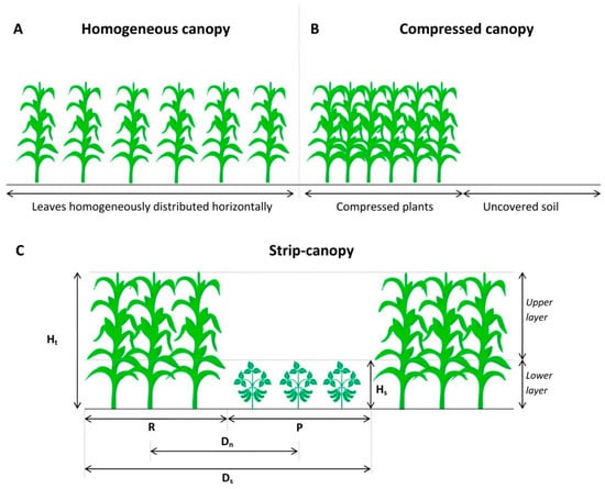 (A) Homogeneous canopy: leaves are distributed homogeneously horizontally; (B) compressed canopy: rows of a strip-planted crop are compressed on one side and the uncovered soil paths on the other side of the field; and (C) strip planted canopy: rows of plants form strips in the field and can be intercropped with other plant species. Ht and Hs, the plants heights of the taller and shorter plants in the field, respectively; R and P, the strip and path widths, respectively (each plant species has R and P specified); Ds, the distance between equal sides of two strips of the same plant species; and Dn, the distance between the middle points of two neighboring strips of different plant species.