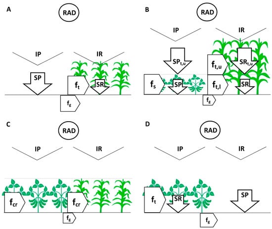 Radiation distribution in strip-crop cultivation scenarios. (A) First crop (main) is single, (B) intercropping, main crop is taller, (C) intercropping, crops are of equal height, (D) second crop (companion) is single. RAD, incoming radiation. See Table 1 for the description of the other symbols.