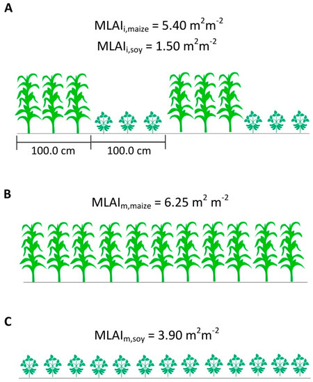 Intercropping is a method employed for agricultural sustainability in which two or more plant species are simultaneously cultivated together on the same land [,,] Intercropping systems are favored by a better land occupation, a decrease in the use of agrochemicals, better soil conservation, and yield diversification, among other benefits [,,,]. Management challenges for intercropping include the use of an optimum plant density, cultivation design or plant strip widths, and the best times of seeding for each of the crops to maximize crop productivities []. A better strategy of intercropping cultivation can be facilitated and accomplished with multi-species cropping system modeling [].