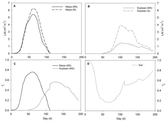 (A) LAI of intercropped maize (MS) and monocrop (M), (B) intercropped soybean LAI (MS) and monocrop (S), (C) fraction of the radiation interception by plants (ft) and (D) fraction of soil radiation interception (fg).