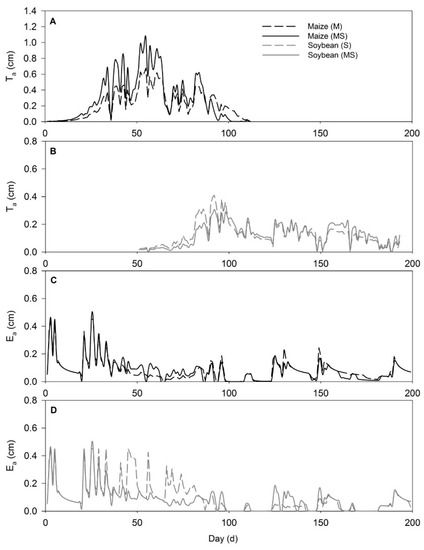 (A) and (B) Maize and soybean daily transpiration rates (Ta), and (C) and (D) soil evaporation rates (Ea).