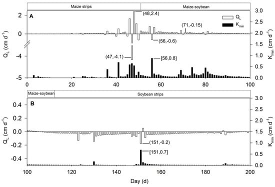 Soil lateral flux (QL) between soil strips and average minimum hydraulic conductivity (Kmin) from day number 0 to 100 (A) and from 100 to 200 (B). Horizontal bars over the graphs indicate the type and period of cultivation. // means a break in the vertical axis of QL from −1.0 to −3.5 cm d−1. Indicated points in the graphs are (Day,QL) and [Day,Kmin]. Positive values of QL indicate that water flows from the soil under soybean towards the soil under maize.