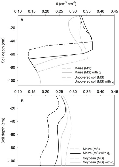 Soil water content (θ) in soil profile of maize and soybean simulated with (solid lines) and without (dashed lines) soil water lateral flux on days 48 (A) and 71 (B).