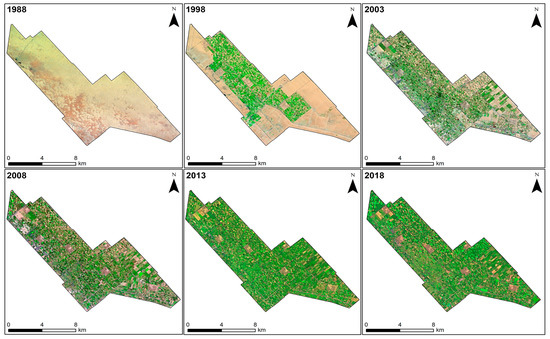 Pre-processing of remote sensing data prior to change detection studies is a fundamental procedure [45]. All imageries (Figure 2) were geometrically projected to the projection WGS 84 (UTM zone 36). All the acquired images were cloud coverage-free, carefully chosen using the available metadata filtering on the USGS website. Therefore, atmospheric correction is not required. Furthermore, it is not required in such change detection studies as long as the used satellite images are geometrically corrected [46]. All images were subset (Clipped) and masked to the boundary (Shapefile) of Tiba District, then, a layer stacking (Bands compositing) operation was performed for each image, involving all the bands except Band 6 (Thermal band) and Band 8 (Panchromatic band) if existed (i.e., Landsat 7 and 8 images).