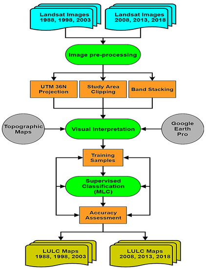 The second step of the classification was to undertake the supervised classification. Based on the field inspection and images’ visual interpretation, three LULC classes were distinguished in Tiba District: Agricultural land, barren land, and urban land. Training sets were drawn for each of the pre-identified LULC classes by drawing polygons per each representative site per LULC class. Using the pixels located within these polygons, various spectral signatures for the corresponding LULC classes were derived and generated [47,48]. The maximum likelihood classification was used to undertake the supervised classification for the analyzed imageries, since it is the most common supervised classification technique being used to classify satellite images. The basis of the maximum likelihood classification technique is the likelihood of each group of pixels with similar spectral signatures to be grouped into one LULC class [49,50]. Therefore, pixels with similar spectral signatures in each class were grouped together forming the three major LULC classes in the study area. The two topographic maps, high-resolution Google Earth Pro images and the investigated GCPs were used to improve the classification approach. Six LULC maps were generated for the used dates; 1988, 1998, 2003, 2008, 2013, and 2018. Figure 3 shows the flowchart of the methodology undertaken in this article.