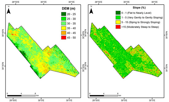 The SRTM DEM analysis results (Figure 4) demonstrate that the study area has an elevation that ranges from 20 to 50 m (above sea level). Based on the DEM, the slope percentage was generated. The slope classes were produced according to the Food and Agriculture Organization of the United Nations (FAO) [55]. The slope map (Figure 4) shows that the dominant slopes percentages in the study area are nearly level (0–1%) and gently sloping (1–5%).