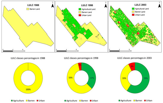 Geospatial distribution and area percentages for the LULC classes in 1988, 1998, 2003.