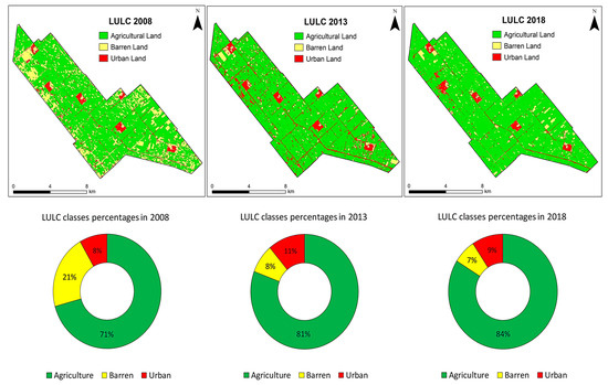 Six LULC maps (corresponding to six time periods) from 1988 to 2018 have been generated from the utilized maximum likelihood supervised classification. For each time period, three major LULC classes were observed in Tiba District: Agricultural land, barren land, and urban land. Figure 5 and Figure 6 show the geospatial distribution and the area percentages for the LULC classes in the study area for the six dates.
