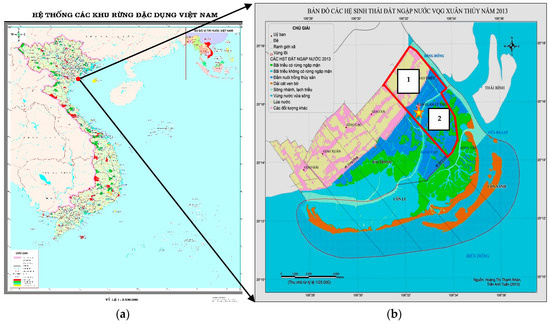Description of the study site. (a) Map of protected areas in Vietnam; (b) The yellow area is surveyed rice farms (Number 1); the blue area is surveyed aquaculture farms (Number 2); the green area is mangrove trees; the yellow star signifies the XTNP (Xuan Thuy National Park) management board office.